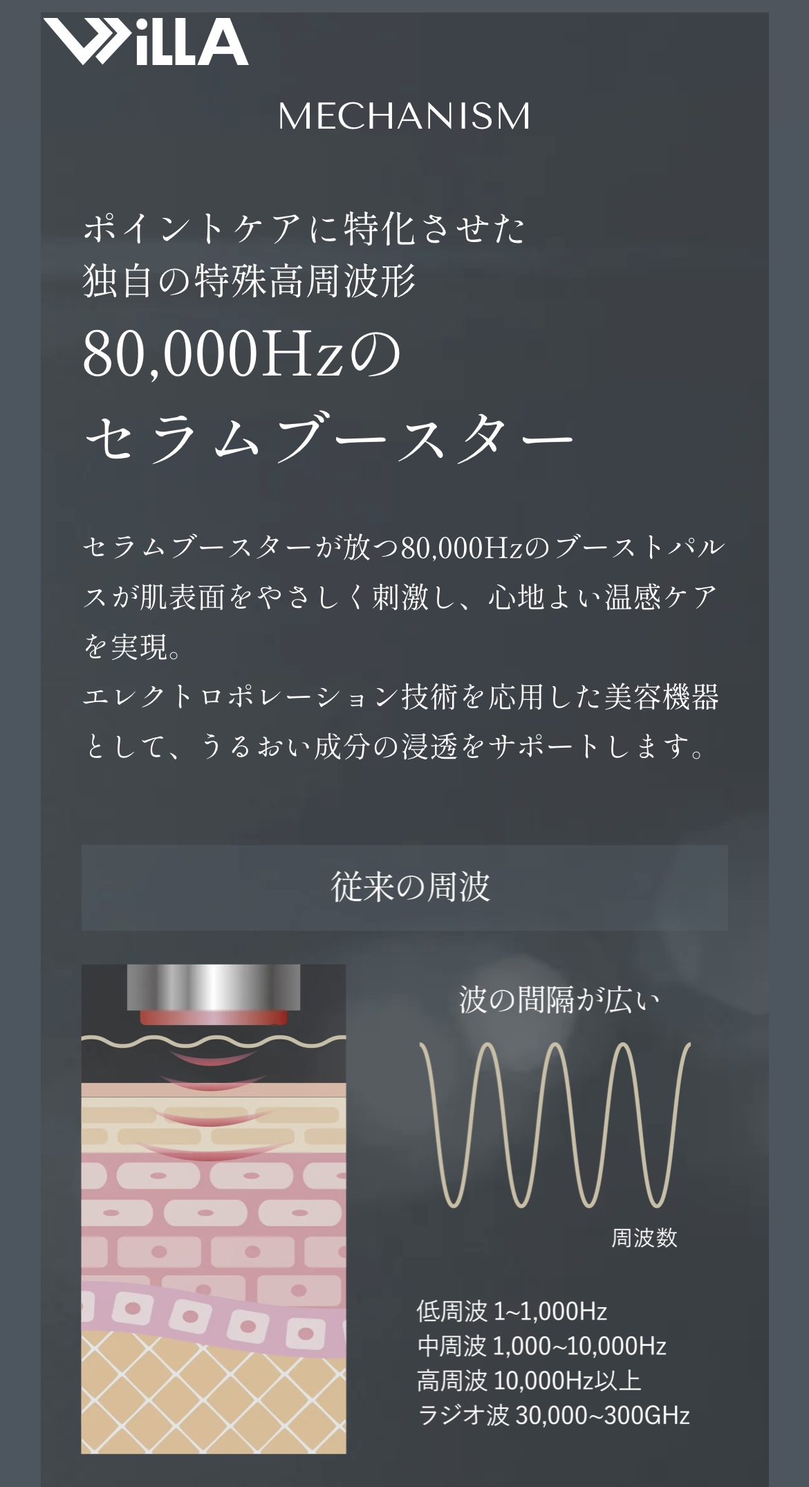 • 独自高周波技術「ブーストパルス(80,000Hz)」 を搭載し、肌をやさしく温めます。