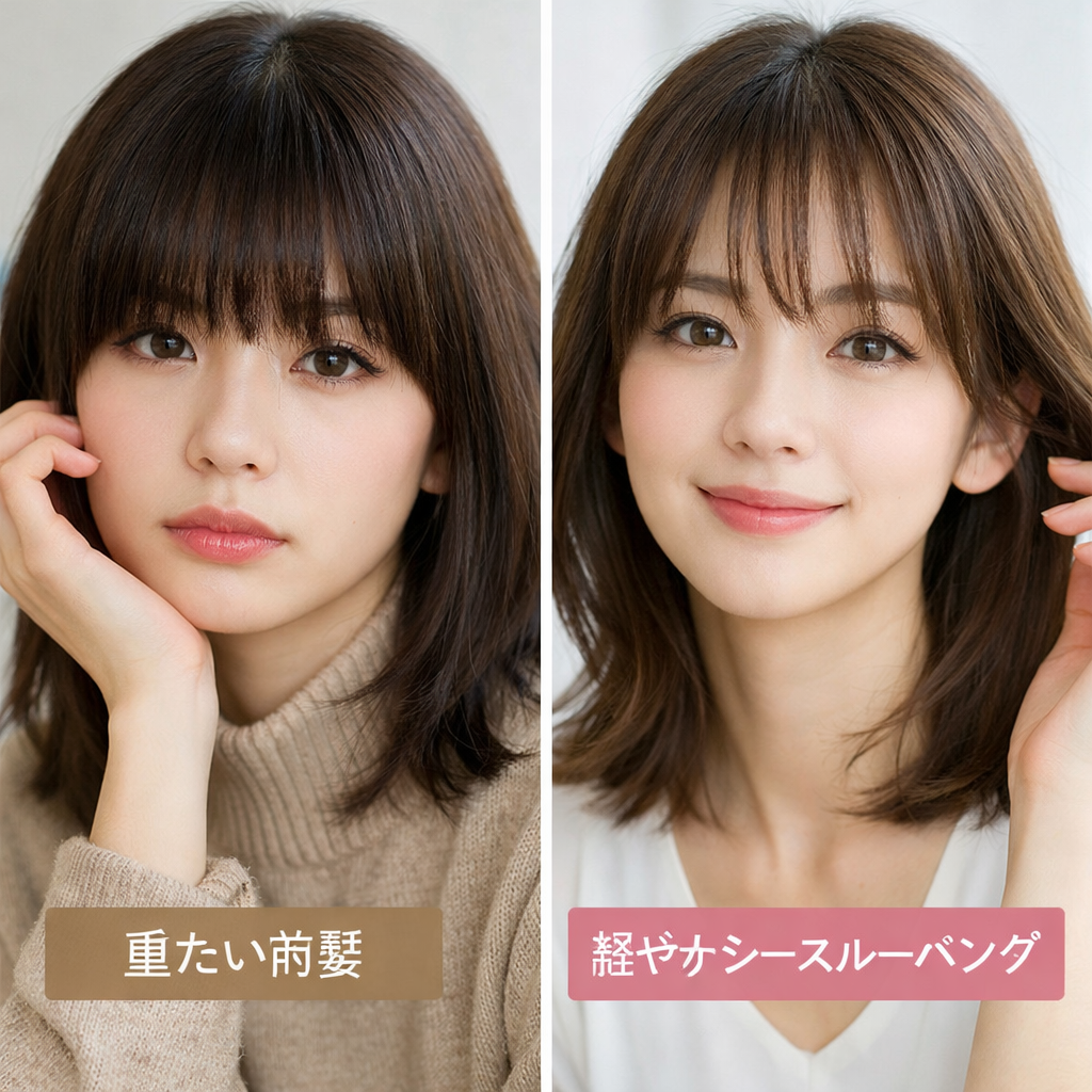 重すぎる前髪は顔全体を暗く見せ、年齢を強調してしまいます。30代40代は「軽さ」と「透け感」が重要。シースルー気味や隙間のある前髪にすることで、抜け感が出て一気に若々しい印象になります。