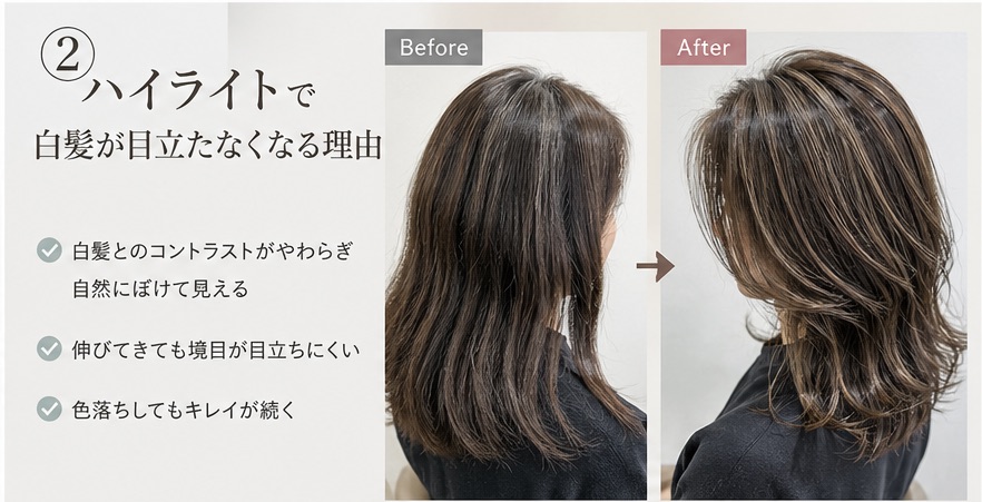 髪全体に自然な立体感が生まれ、白髪との境目がなじみやすくなり、