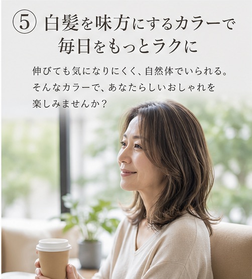 白髪を自然に馴染ませて、目立たなくするナチュラル仕上げ