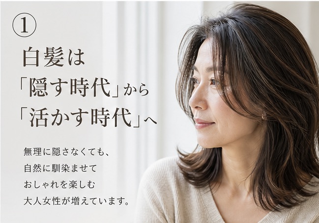 これまで白髪はしっかり染めて隠すのが一般的でしたが、最近は考え方が変わってきています。